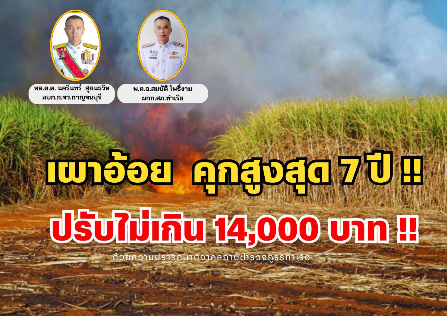 สถานีตำรวจภูธรท่าเรือ ขอประชาสัมพันธ์ ห้ามเผาอ้อย เผาขยะ หรือเผาสิ่งของใดๆ ให้เกิดมลพิษ ขอความร่วมมื