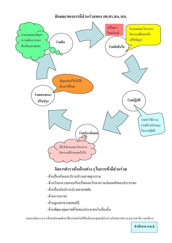 3. ภารกิจการมีส่วนร่วม เนื่องจากองค์กร กต.ตร.ในปัจจุบันเป็นองค์กรที่มีประชาชนในท้องถิ่น / ชุมชนเป็นกรรมการในสัดส่วนที่เท่า ๆ กันกับข้าราชการ ดังนั้นตามระเบียบ ก.ต.ช. ว่าด้วยหลักเกณฑ์และวิธีการส่งเสริมให้ท้องถิ่นและชุมชนมีส่วนร่วมในกิจการตำรวจ พ.ศ. 2549 จึงกำหนดให้ กต.ตร. เป็นองค์กรสำคัญมีบทบาทเป็นแกนนำในการให้ท้องถิ่น/ชุมชน เข้ามามีส่วนร่วมในการป้องกันปราบปรามอาชญากรรมและการรักษาความปลอดภัยในชีวิตและทรัพย์สินของประชาชน โดยกำหนดบทบาท ภารกิจของ กต.ตร.สน./สภ. กต.ตร.กทม. และ กต.ตร.จังหวัด ไว้ดังนี้